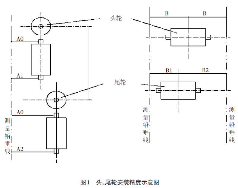 提升机全部安装完毕后,头、尾轮轴水平度允差≤0.3/1000,同时应符合图1和表2的规定。