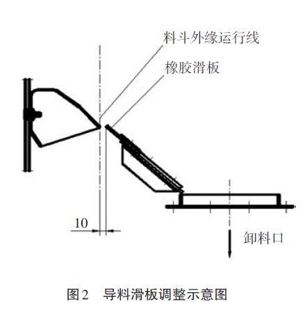 为控制物料回流,在提升机头部出料口设置了一个可调节的橡胶滑板,在料斗安装完后,调整橡胶滑板外缘使它与料斗外缘运行线之间的距离为10mm,将其紧固(见图2)。