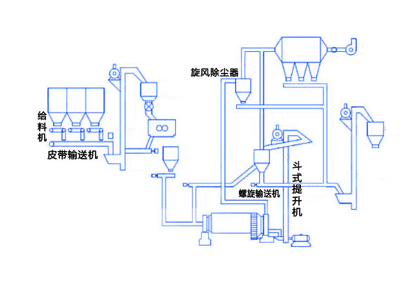 石膏粉生产线主要加工流程为:石膏矿石—振动给料机-破碎机-斗式提升机-原料仓-斗式提升机-沸腾炉(配除尘器)-斗式提升机-输送机-储存输送-成品。其中对石膏矿石的输送提升是整个石膏粉生产线重要的环节。
