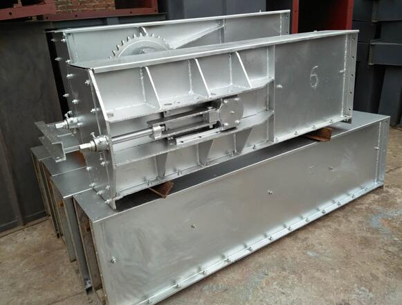 U型螺旋输送机进出料口有3种:方型出料口、手推式出料口和齿条式出料口。这些由用户自己在使用现场在机身上进行焊接,需要注意的是,布置进出料口的时候,位置很重要,要确保料口至端部的距离,同时还应避免料口与吊轴承加油杯、机壳链接法兰、底座等的碰撞。
