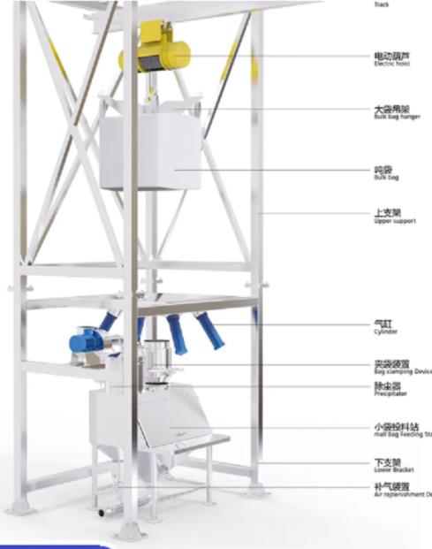 1、设备支架及护板;2、电动葫芦;3、吨袋吊架;4、夹袋装置;5、拍打、振动、磁选装置;6、缓冲料仓;